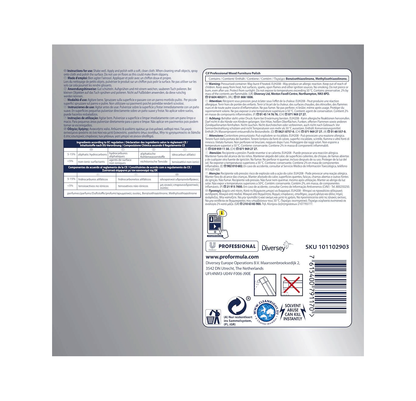 Limpa, protege e dá brilho num único passo. Fórmula profissional; limpa conferindo um acabamento acetinado. Tecnologia de elevada eficiência, que contém tensoativos, para uma excelente limpeza. Não inflamável. Pronto a usar. Tecnologia Neutralizadora de Odores (O.N.T. - Odour Neutralizing Technology).